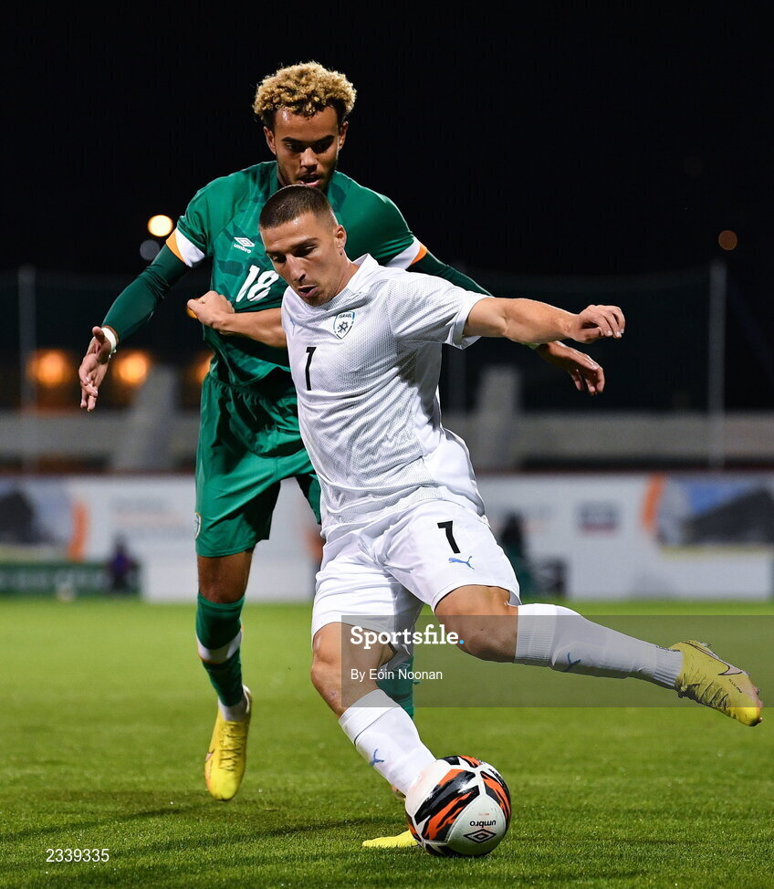 23 September 2022; Osher Davida of Israel in action against Tyreik Wright of Republic of Ireland during the UEFA European U21 Championship play-off first leg match between Republic of Ireland and Israel at Tallaght Stadium in Dublin. Photo by Eóin Noonan/Sportsfile