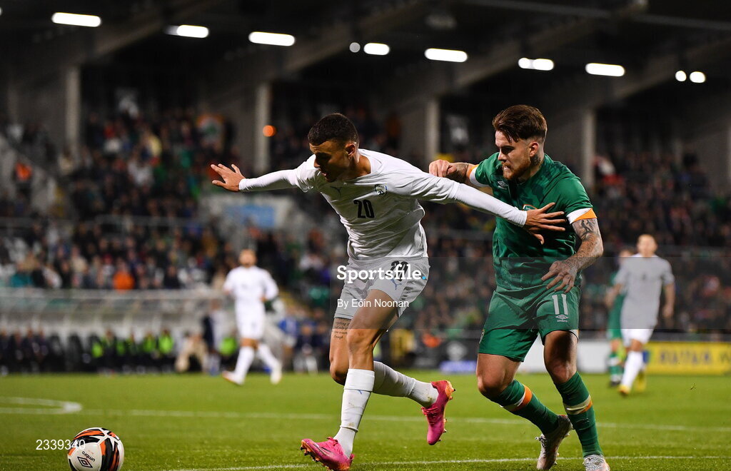 23 September 2022; Stav Lemkin of Israel in action against Aaron Connolly of Republic of Ireland during the UEFA European U21 Championship play-off first leg match between Republic of Ireland and Israel at Tallaght Stadium in Dublin. Photo by Eóin Noonan/Sportsfile