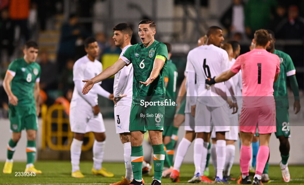 23 September 2022; Conor Coventry of Republic of Ireland appeals to the assistant referee during the UEFA European U21 Championship play-off first leg match between Republic of Ireland and Israel at Tallaght Stadium in Dublin. Photo by Seb Daly/Sportsfile