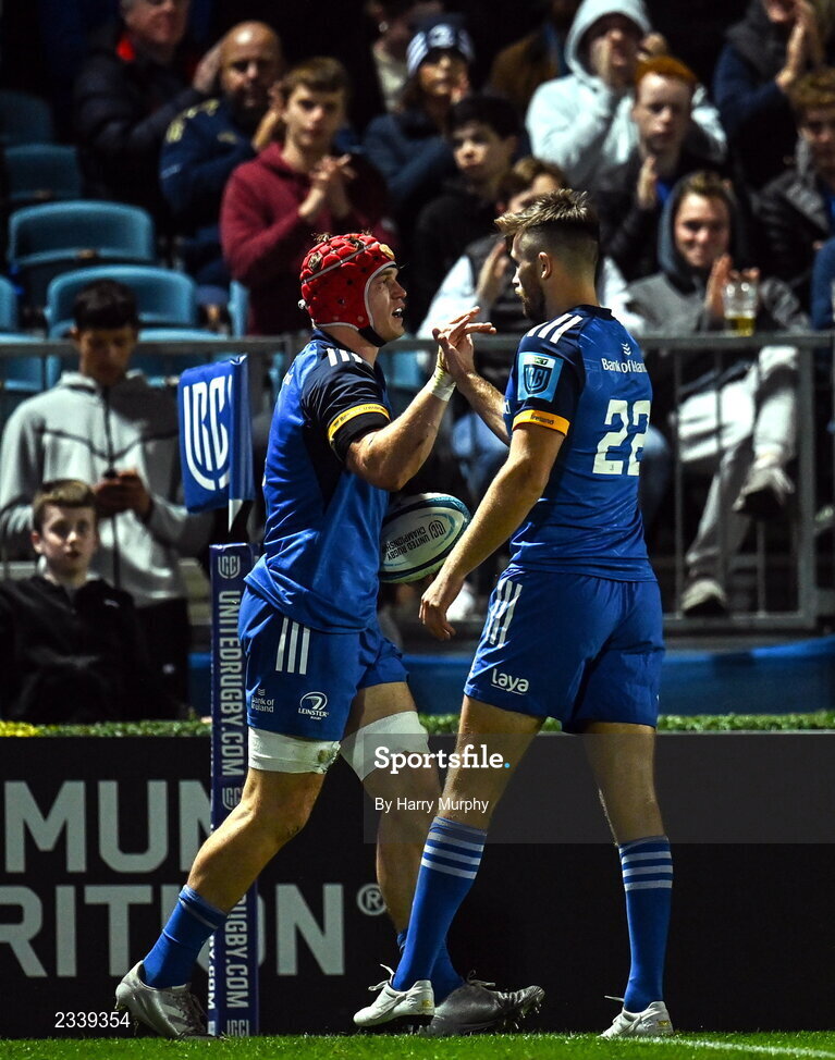 23 September 2022; Josh van der Flier of Leinster celebrates with teammate Ross Byrne after scoring his side's fourth try during the United Rugby Championship match between Leinster and Benetton at the RDS Arena in Dublin. Photo by Harry Murphy/Sportsfile