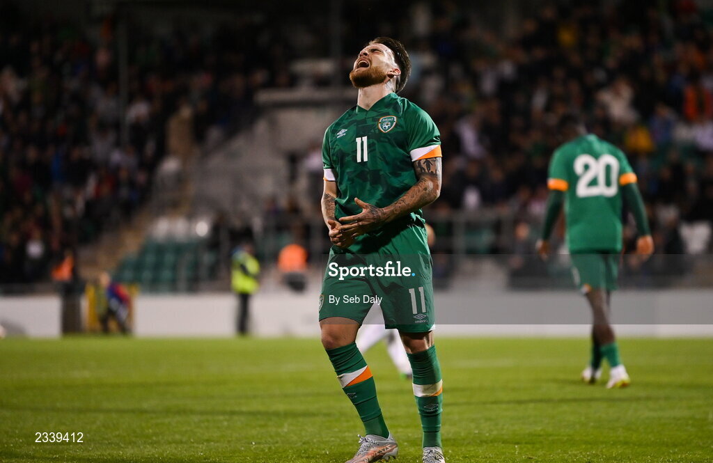23 September 2022; Aaron Connolly of Republic of Ireland reacts during the UEFA European U21 Championship play-off first leg match between Republic of Ireland and Israel at Tallaght Stadium in Dublin. Photo by Seb Daly/Sportsfile