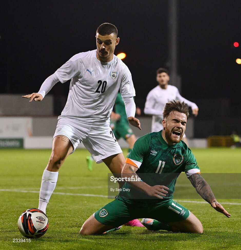 23 September 2022; Aaron Connolly of Republic of Ireland is fouled by Stav Lemkin of Israel during the UEFA European U21 Championship play-off first leg match between Republic of Ireland and Israel at Tallaght Stadium in Dublin. Photo by Seb Daly/Sportsfile
