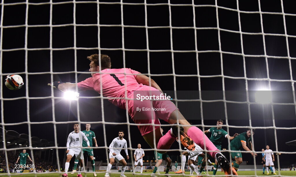 23 September 2022; Evan Ferguson of Republic of Ireland scores his side's first goal past Israel goalkeeper Daniel Peretz during the UEFA European U21 Championship play-off first leg match between Republic of Ireland and Israel at Tallaght Stadium in Dublin. Photo by Eóin Noonan/Sportsfile