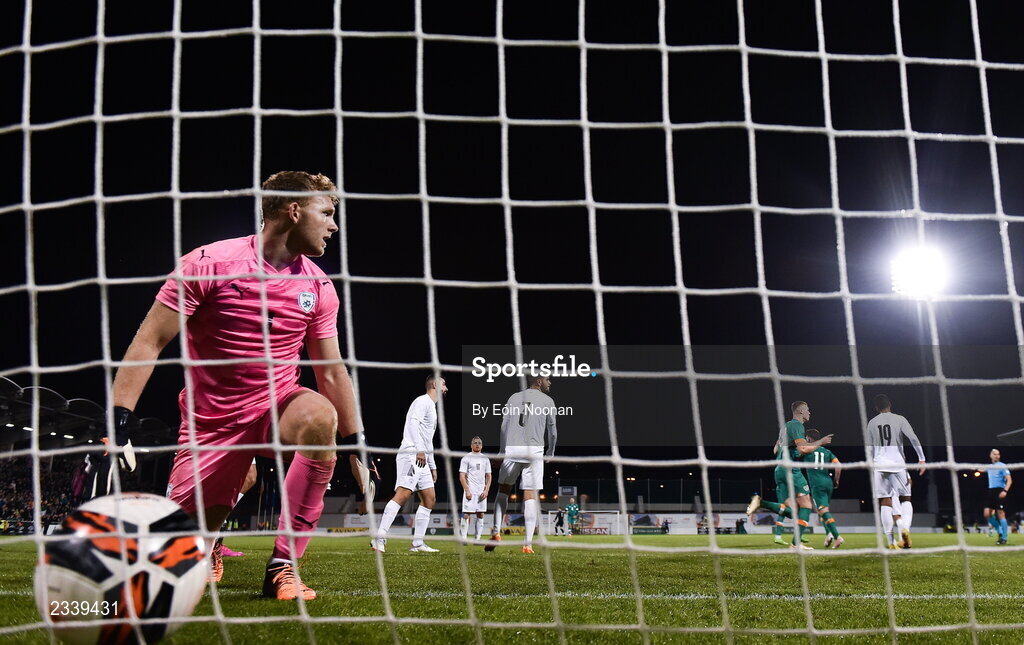 23 September 2022; Israel goalkeeper Daniel Peretz reacts after conceding his side's first goal during the UEFA European U21 Championship play-off first leg match between Republic of Ireland and Israel at Tallaght Stadium in Dublin. Photo by Eóin Noonan/Sportsfile