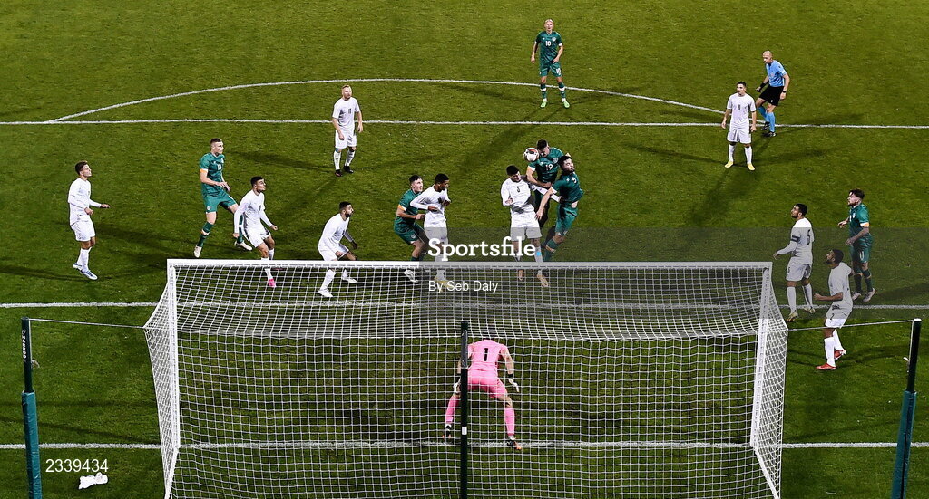 23 September 2022; Evan Ferguson of Republic of Ireland heads his side's first goal during the UEFA European U21 Championship play-off first leg match between Republic of Ireland and Israel at Tallaght Stadium in Dublin. Photo by Seb Daly/Sportsfile