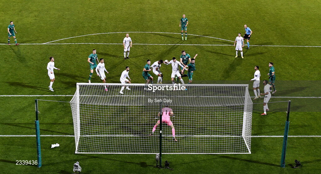 23 September 2022; Evan Ferguson of Republic of Ireland heads his side's first goal during the UEFA European U21 Championship play-off first leg match between Republic of Ireland and Israel at Tallaght Stadium in Dublin. Photo by Seb Daly/Sportsfile