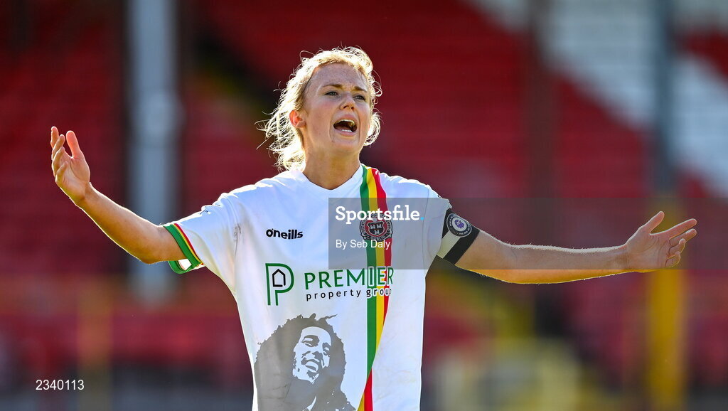 24 September 2022; Erica Burke of Bohemians reacts during the EVOKE.ie FAI Women's Cup Semi-Final match between Shelbourne and Bohemians at Tolka Park in Dublin. Photo by Seb Daly/Sportsfile