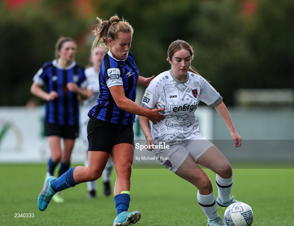 24 September 2022; Ceola Bergin of Wexford Youths in action against Muireann Devaney of Athlone Town during a 2022 EVOKE.ie FAI Women's Cup Semi-Finals match between Athlone Town and Wexford Youths at Athlone Town Stadium in Westmeath. Photo by Michael P Ryan/Sportsfile