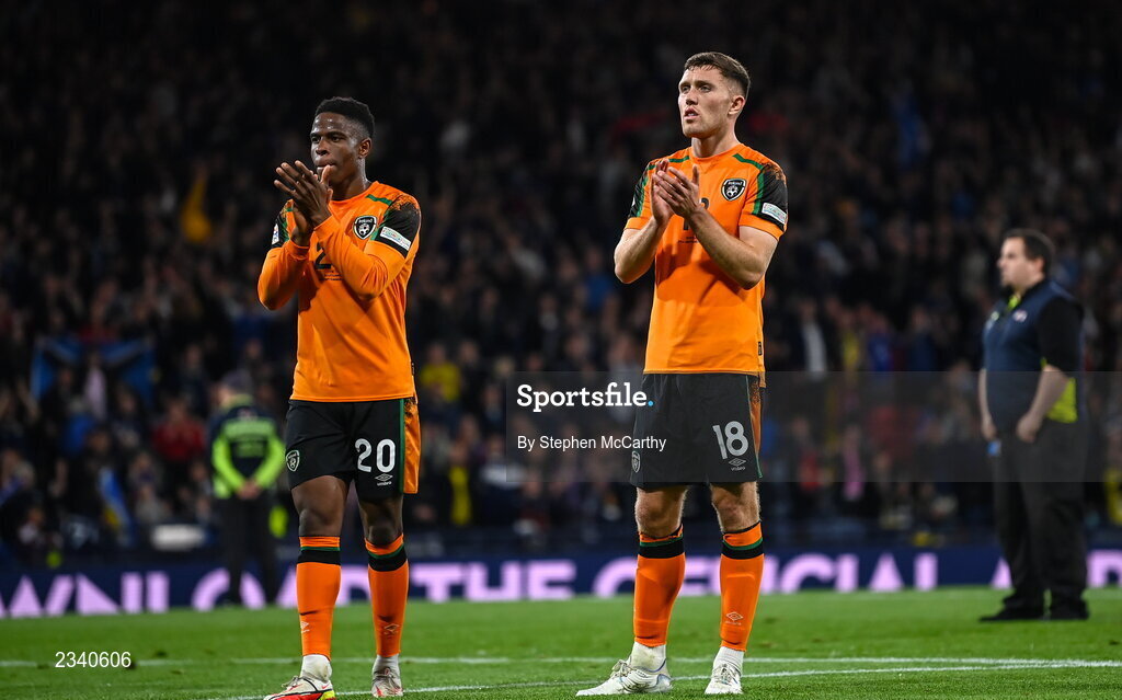 24 September 2022; Dara O'Shea, right, and Chiedozie Ogbene of Republic of Ireland after UEFA Nations League B Group 1 match between Scotland and Republic of Ireland at Hampden Park in Glasgow, Scotland. Photo by Stephen McCarthy/Sportsfile