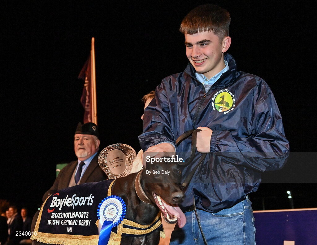 24 September 2022; Kennelhand Shane Hanlon celebrates with Born Warrior after winning the 2022 BoyleSports Irish Greyhound Derby Final at Shelbourne Park in Dublin. Photo by Seb Daly/Sportsfile