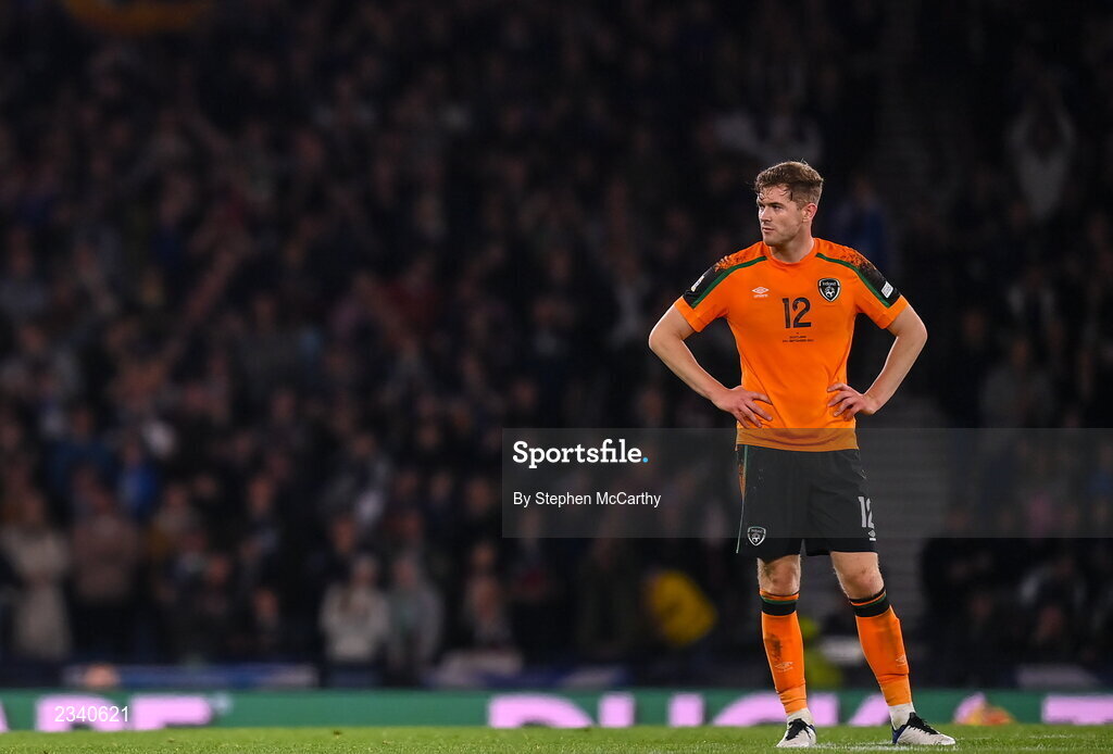 24 September 2022; Nathan Collins of Republic of Ireland reacts during UEFA Nations League B Group 1 match between Scotland and Republic of Ireland at Hampden Park in Glasgow, Scotland. Photo by Stephen McCarthy/Sportsfile