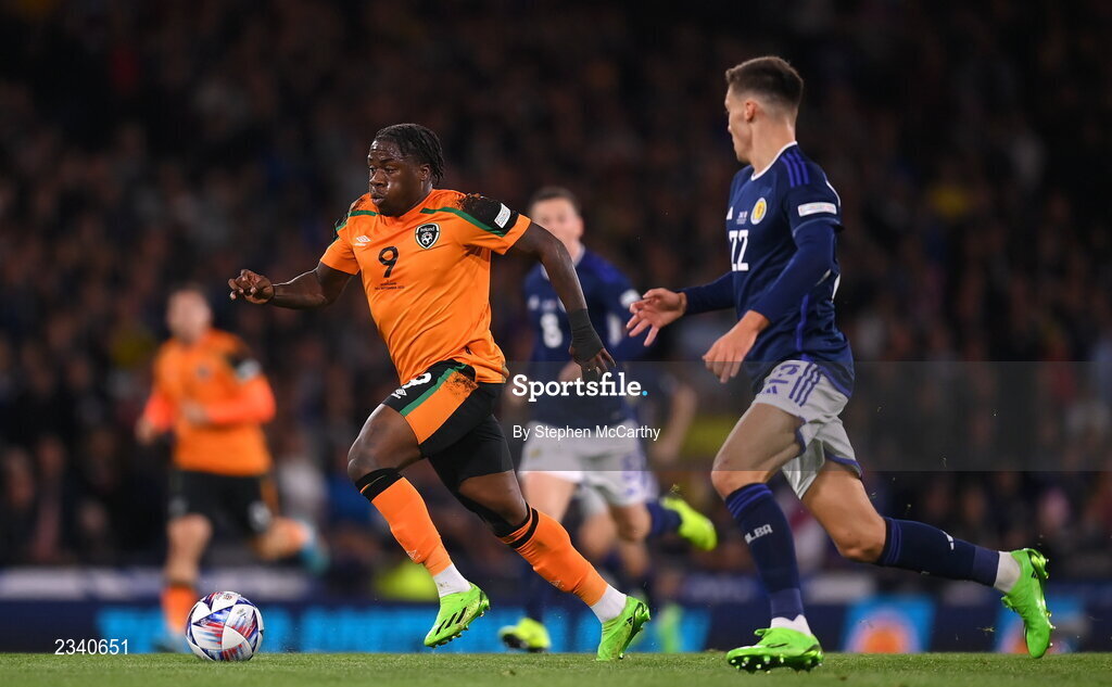 24 September 2022; Michael Obafemi of Republic of Ireland and Aaron Hickey of Scotland during UEFA Nations League B Group 1 match between Scotland and Republic of Ireland at Hampden Park in Glasgow, Scotland. Photo by Stephen McCarthy/Sportsfile