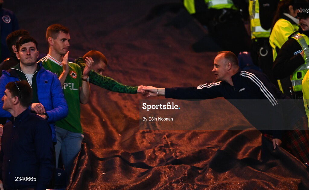 24 September 2022; A Scotland supporter fistbumps a Republic of Ireland supporter after UEFA Nations League B Group 1 match between Scotland and Republic of Ireland at Hampden Park in Glasgow, Scotland. Photo by Eóin Noonan/Sportsfile