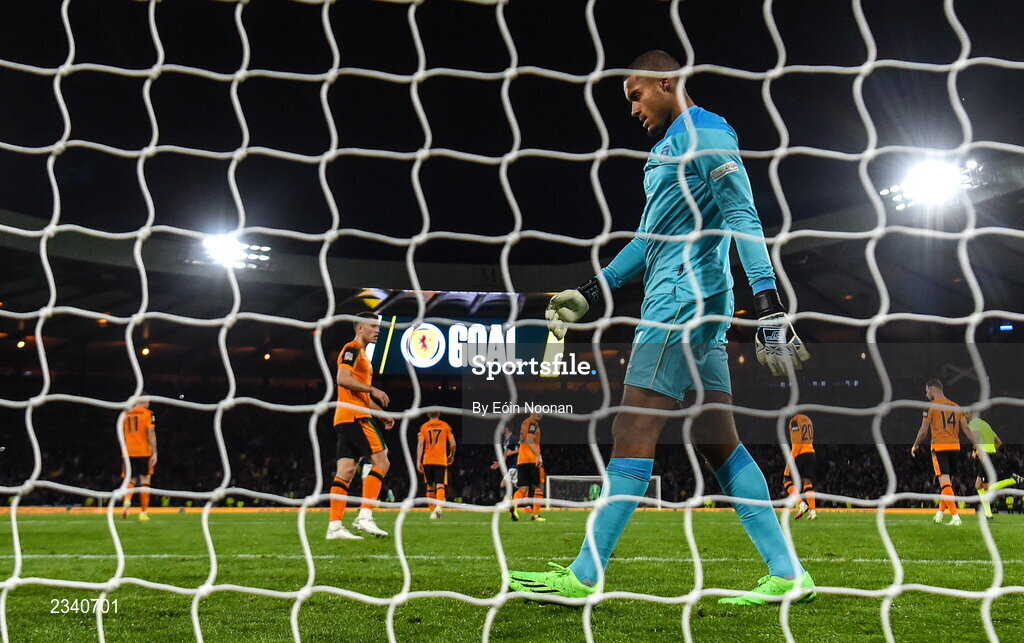 24 September 2022; Republic of Ireland goalkeeper Gavin Bazunu reacts after conceding his side's second goal, a penalty, during UEFA Nations League B Group 1 match between Scotland and Republic of Ireland at Hampden Park in Glasgow, Scotland. Photo by Eóin Noonan/Sportsfile