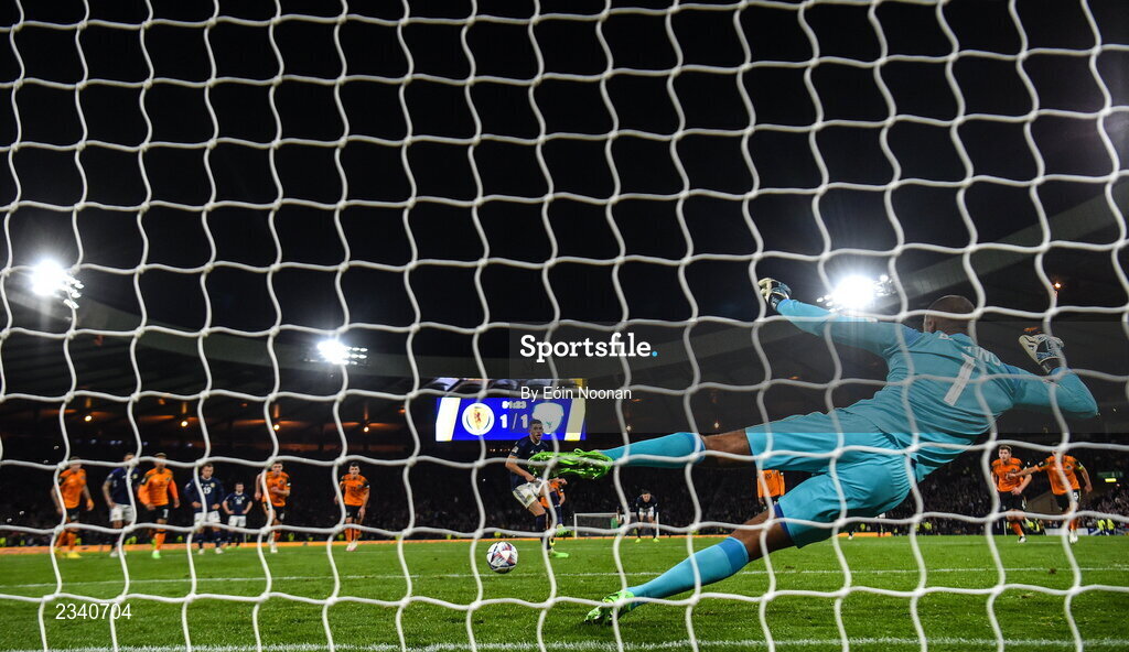 24 September 2022; Republic of Ireland goalkeeper Gavin Bazunu fails to save the penalty of Ryan Christie of Scotland during UEFA Nations League B Group 1 match between Scotland and Republic of Ireland at Hampden Park in Glasgow, Scotland. Photo by Eóin Noonan/Sportsfile