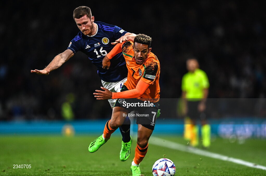 24 September 2022; Callum Robinson of Republic of Ireland and Anthony Ralston of Scotland during UEFA Nations League B Group 1 match between Scotland and Republic of Ireland at Hampden Park in Glasgow, Scotland. Photo by Eóin Noonan/Sportsfile