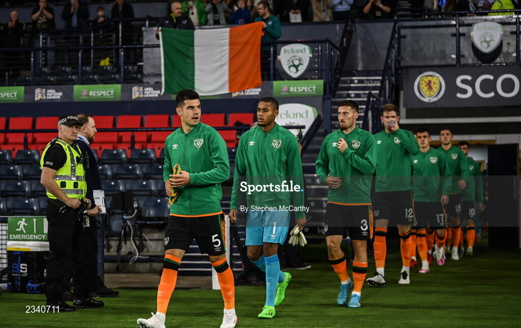 24 September 2022; Republic of Ireland captain John Egan of Republic of Ireland leads his side out before UEFA Nations League B Group 1 match between Scotland and Republic of Ireland at Hampden Park in Glasgow, Scotland. Photo by Stephen McCarthy/Sportsfile