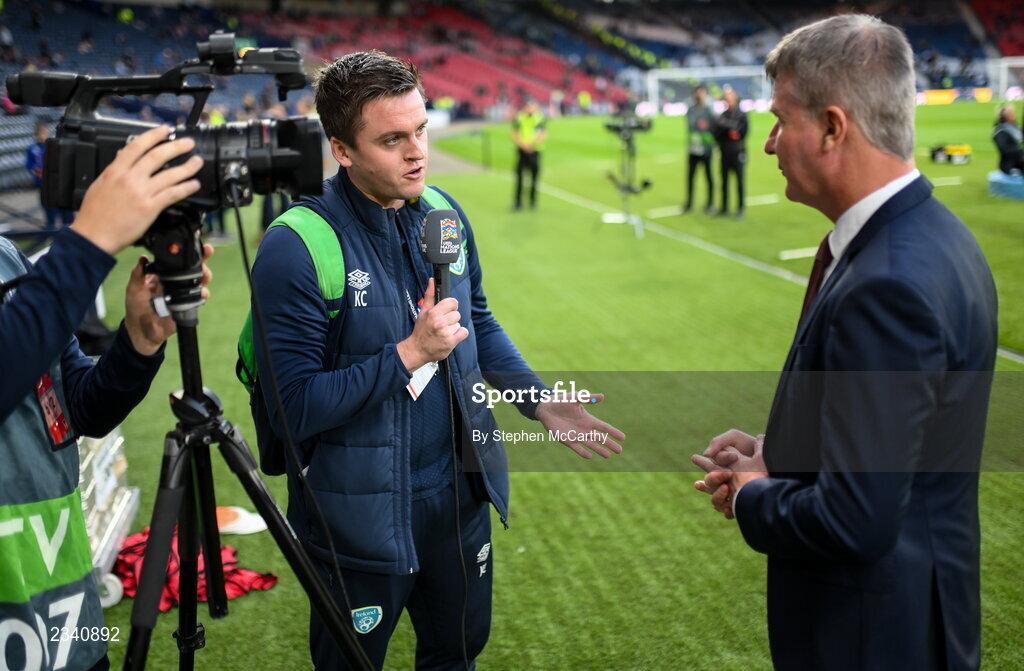 24 September 2022; FAI communications manager Kieran Crowley interviews Republic of Ireland manager Stephen Kenny for FAI TV before the UEFA Nations League B Group 1 match between Scotland and Republic of Ireland at Hampden Park in Glasgow, Scotland. Photo by Stephen McCarthy/Sportsfile