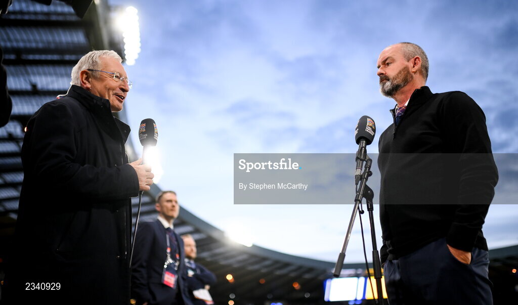 24 September 2022; RTÉ's Tony O'Donoghue interviews Scotland manager Steve Clarke before UEFA Nations League B Group 1 match between Scotland and Republic of Ireland at Hampden Park in Glasgow, Scotland. Photo by Stephen McCarthy/Sportsfile