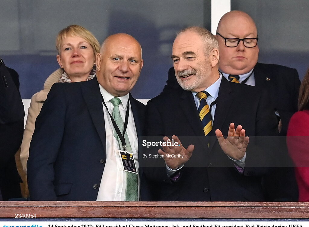 24 September 2022; FAI president Gerry McAnaney, left, and Scotland FA president Rod Petrie during UEFA Nations League B Group 1 match between Scotland and Republic of Ireland at Hampden Park in Glasgow, Scotland. Photo by Stephen McCarthy/Sportsfile