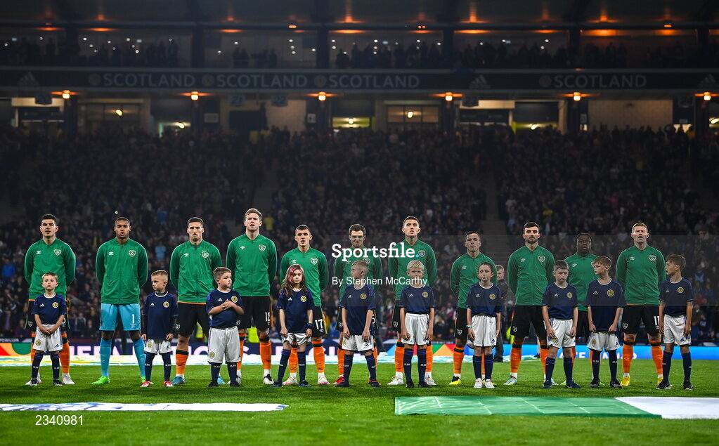24 September 2022; Republic of Ireland players stand for the playing of the National Anthem before UEFA Nations League B Group 1 match between Scotland and Republic of Ireland at Hampden Park in Glasgow, Scotland. Photo by Stephen McCarthy/Sportsfile