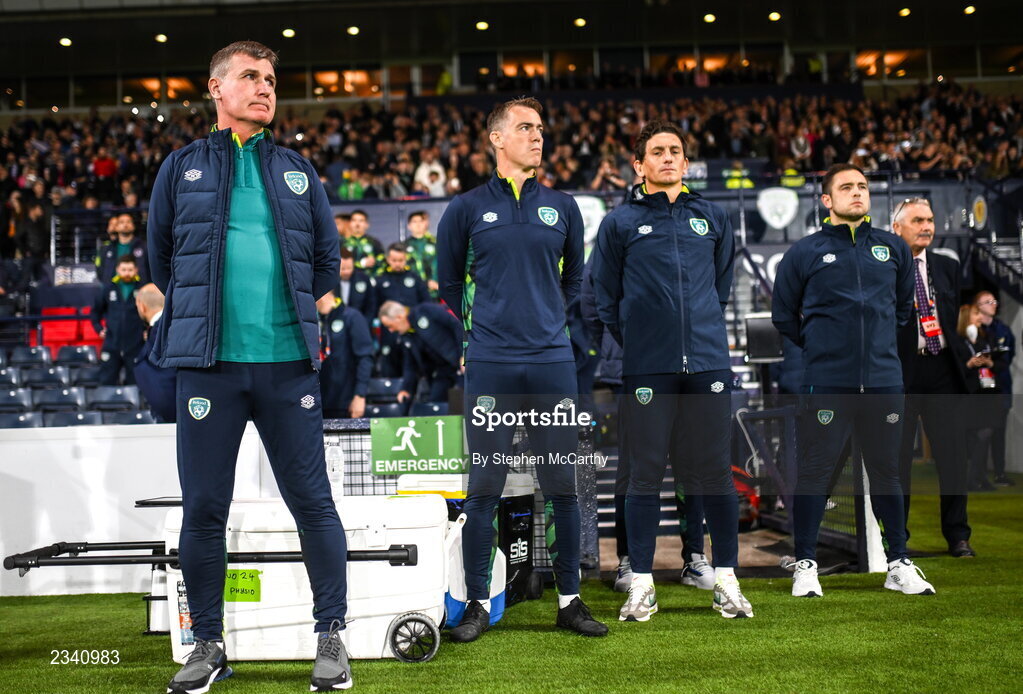 24 September 2022; Republic of Ireland manager Stephen Kenny with, from left, head of athletic performance Damien Doyle, coach Keith Andrews and coach Stephen Rice during UEFA Nations League B Group 1 match between Scotland and Republic of Ireland at Hampden Park in Glasgow, Scotland. Photo by Stephen McCarthy/Sportsfile