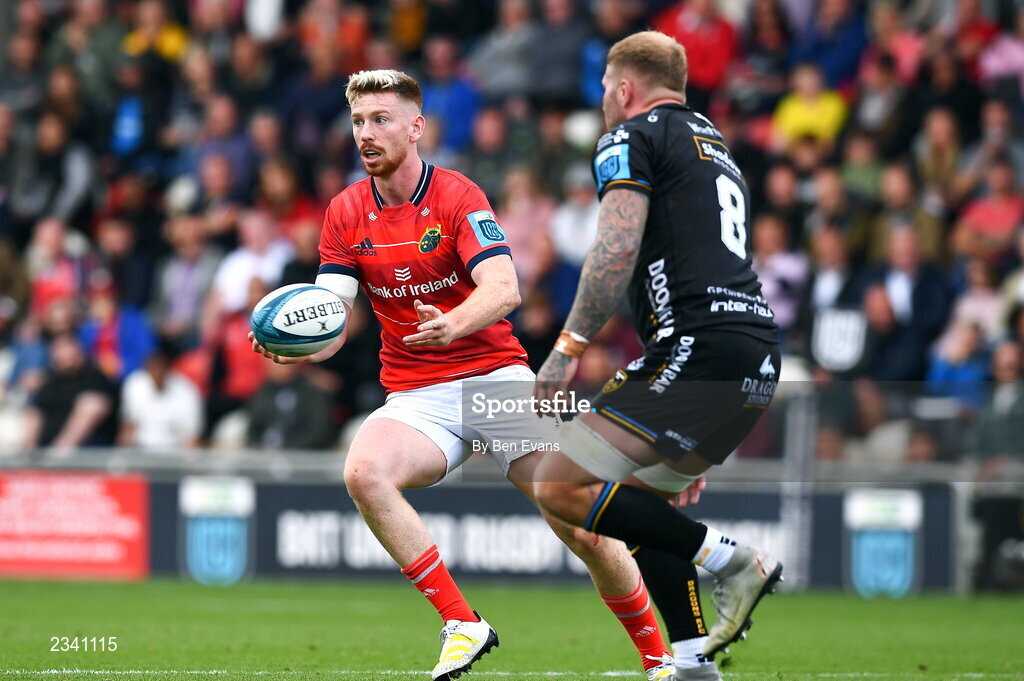 25 September 2022; Ben Healy of Munster in action against Dragons during the United Rugby Championship match between Dragons and Munster at Rodney Parade in Newport, Wales. Photo by Ben Evans/Sportsfile