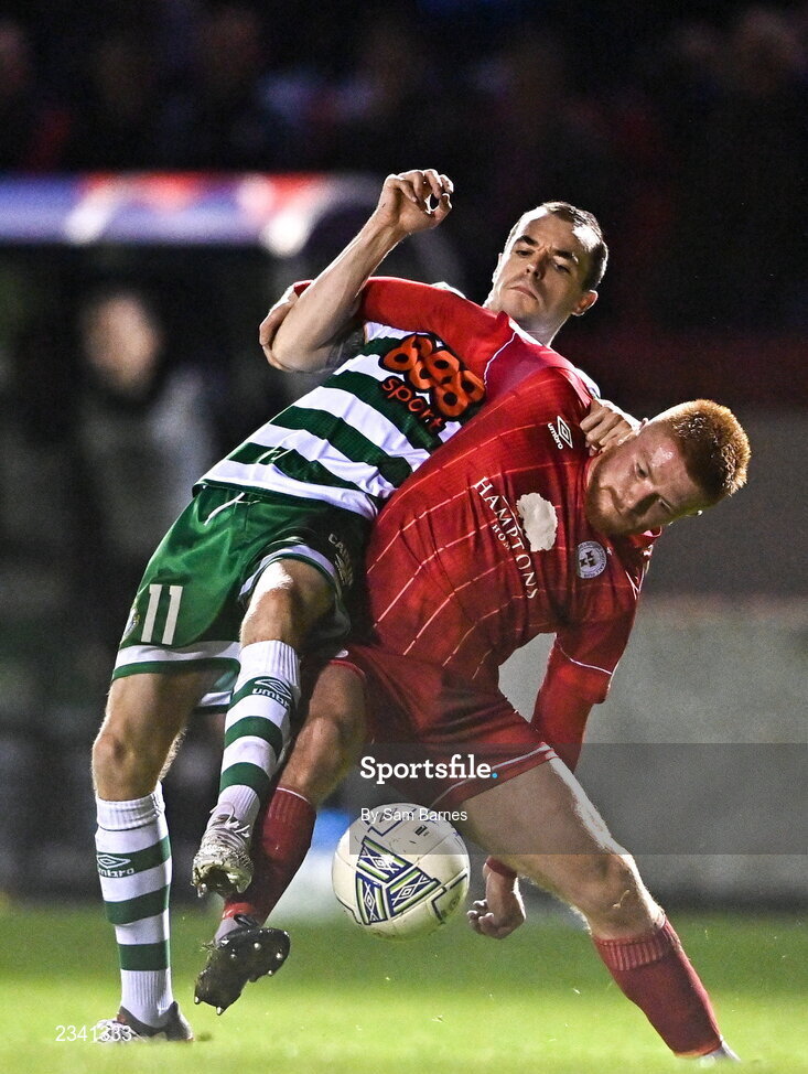 22 September 2022; Sean Kavanagh of Shamrock Rovers in action against Aodh Dervin of Shelbourne during the SSE Airtricity League Premier Division match between Shelbourne and Shamrock Rovers at Tolka Park in Dublin. Photo by Sam Barnes/Sportsfile