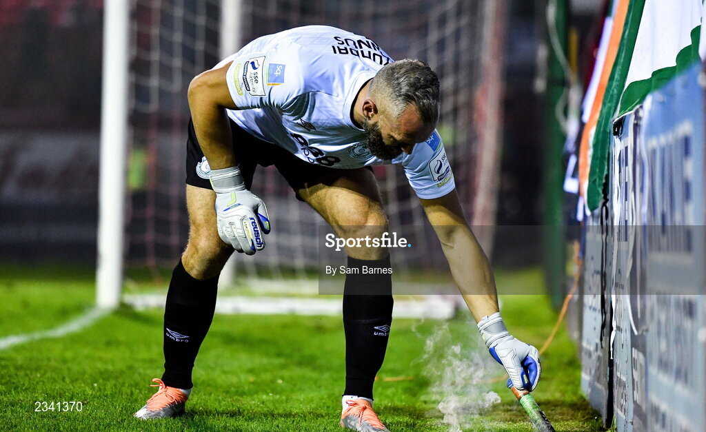 22 September 2022; Shamrock Rovers goalkeeer Alan Mannus removes a flare from the pitch during the SSE Airtricity League Premier Division match between Shelbourne and Shamrock Rovers at Tolka Park in Dublin. Photo by Sam Barnes/Sportsfile