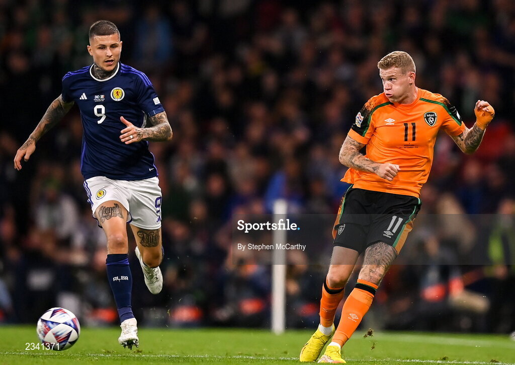 24 September 2022; James McClean of Republic of Ireland and Lyndon Dykes of Scotland during UEFA Nations League B Group 1 match between Scotland and Republic of Ireland at Hampden Park in Glasgow, Scotland. Photo by Stephen McCarthy/Sportsfile