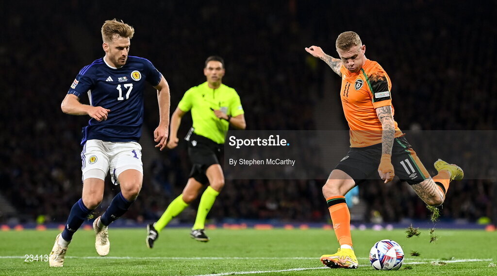 24 September 2022; James McClean of Republic of Ireland and Stuart Armstrong of Scotland during UEFA Nations League B Group 1 match between Scotland and Republic of Ireland at Hampden Park in Glasgow, Scotland. Photo by Stephen McCarthy/Sportsfile