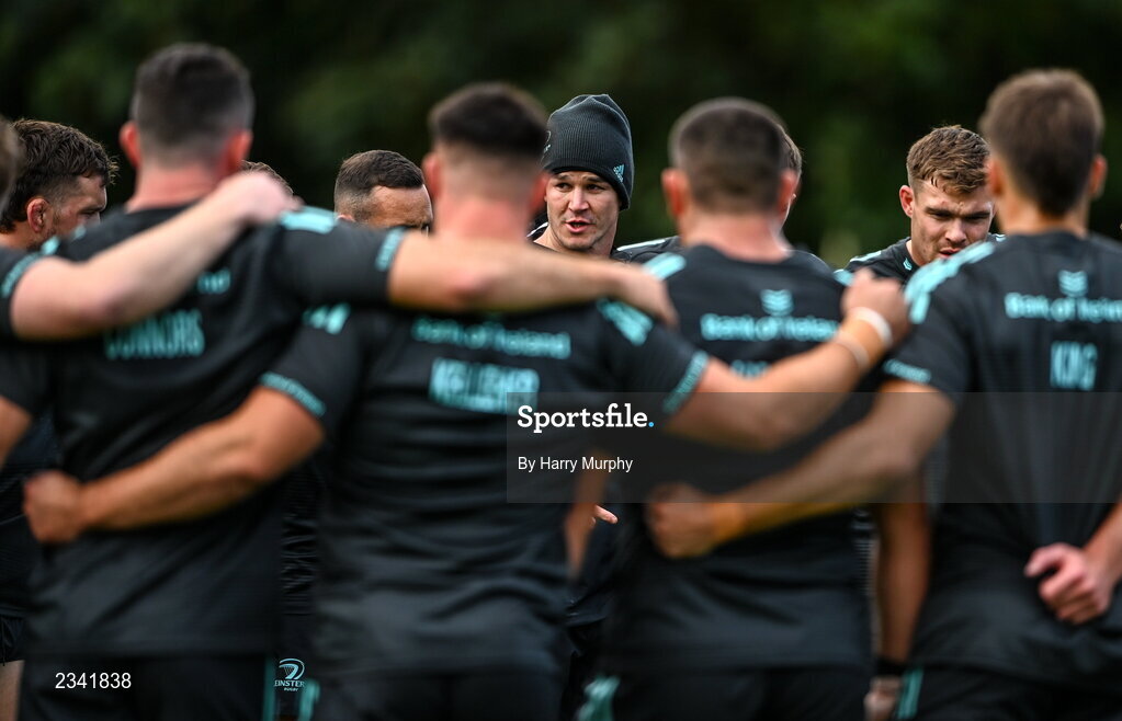 26 September 2022; Jonathan Sexton speaks to his teammates during a Leinster Rugby squad training session at UCD in Dublin. Photo by Harry Murphy/Sportsfile