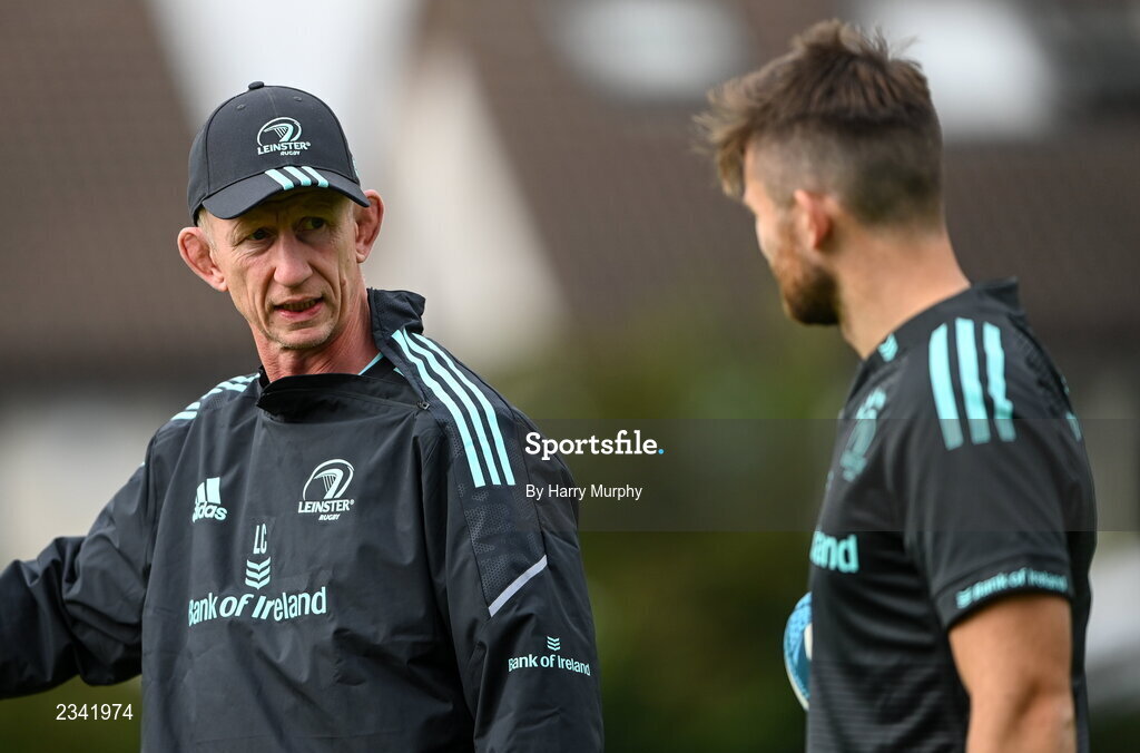 26 September 2022; Head coach Leo Cullen speaks with Ross Byrne during a Leinster Rugby squad training session at UCD in Dublin. Photo by Harry Murphy/Sportsfile