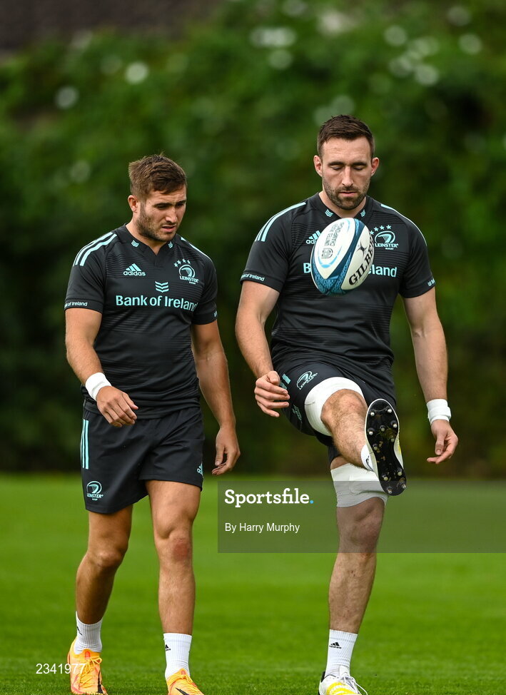 26 September 2022; Jack Conan, right, and Jordan Larmourduring a Leinster Rugby squad training session at UCD in Dublin. Photo by Harry Murphy/Sportsfile