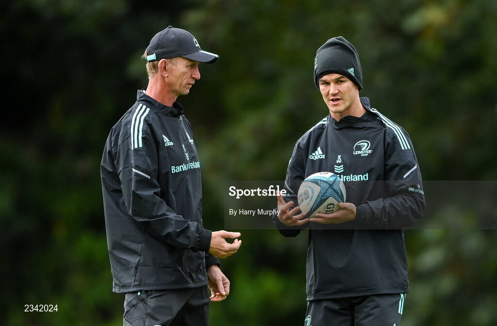 26 September 2022; Head coach Leo Cullen and Jonathan Sextonduring a Leinster Rugby squad training session at UCD in Dublin. Photo by Harry Murphy/Sportsfile