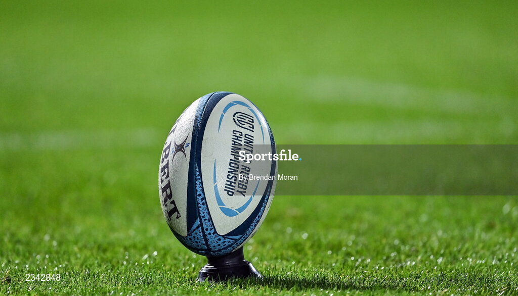 23 September 2022; A general view of a rugby ball and a kicking tee during the United Rugby Championship match between Leinster and Benetton at the RDS Arena in Dublin. Photo by Brendan Moran/Sportsfile
