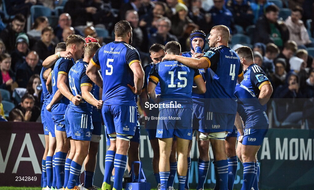 23 September 2022; The Leinster team huddle during the United Rugby Championship match between Leinster and Benetton at the RDS Arena in Dublin. Photo by Brendan Moran/Sportsfile