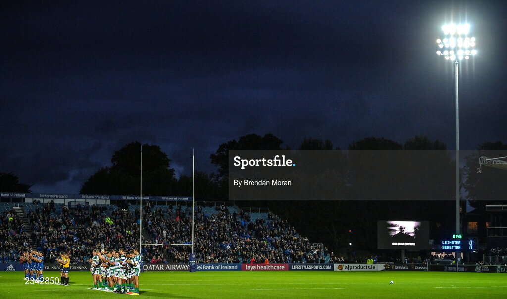 23 September 2022; The teams stand for a minute's silence in memory of the late BBC rugby commentator and former Wales international Eddie Butler before the United Rugby Championship match between Leinster and Benetton at the RDS Arena in Dublin. Photo by Brendan Moran/Sportsfile