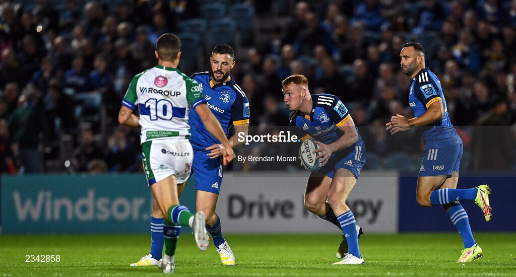 23 September 2022; Ciarán Frawley of Leinster during the United Rugby Championship match between Leinster and Benetton at the RDS Arena in Dublin. Photo by Brendan Moran/Sportsfile