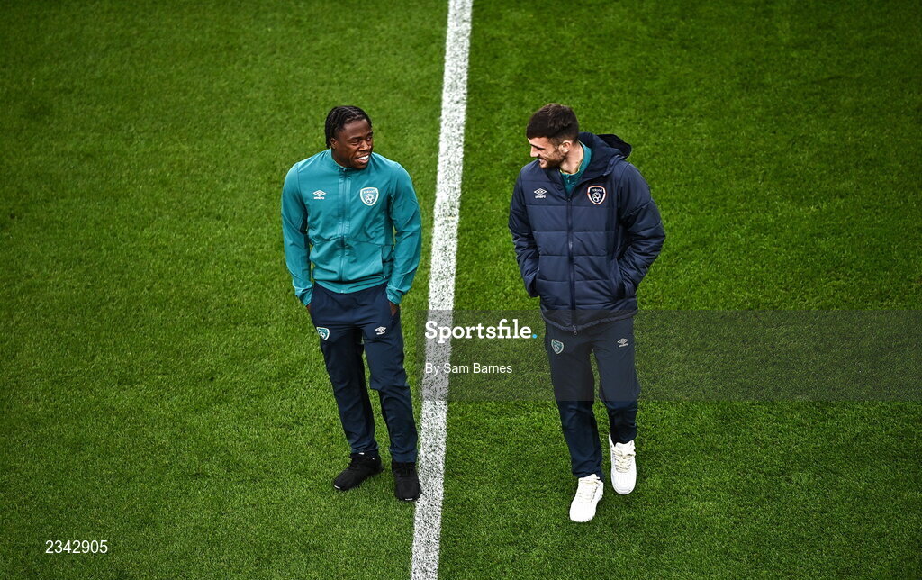 27 September 2022; Michael Obafemi, left, and Troy Parrott of Republic of Ireland before the UEFA Nations League B Group 1 match between Republic of Ireland and Armenia at Aviva Stadium in Dublin. Photo by Sam Barnes/Sportsfile