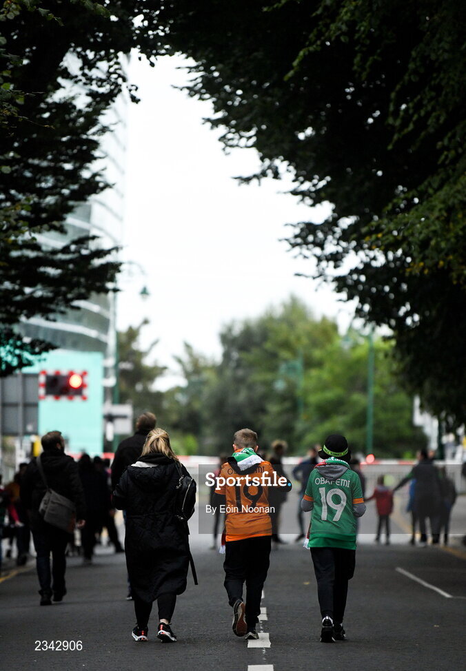 27 September 2022; Young Republic of Ireland supporters make their way to the UEFA Nations League B Group 1 match between Republic of Ireland and Armenia at Aviva Stadium in Dublin. Photo by Eóin Noonan/Sportsfile