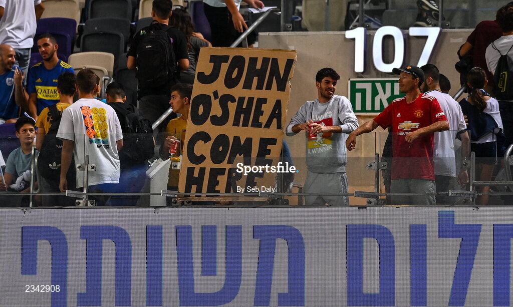 27 September 2022; A banner for Republic of Ireland assistant coach John O'Shea in the crowd before the UEFA European U21 Championship play-off second leg match between Israel and Republic of Ireland at Bloomfield Stadium in Tel Aviv, Israel. Photo by Seb Daly/Sportsfile