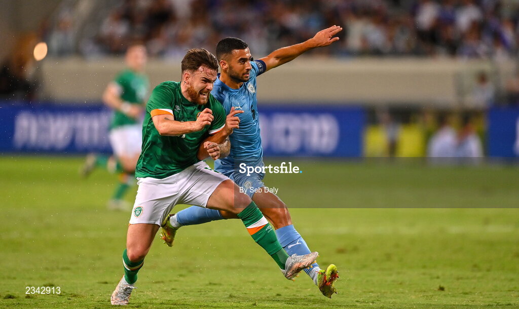 27 September 2022; Aaron Connolly of Republic of Ireland in action against Gil Cohen of Israel during the UEFA European U21 Championship play-off second leg match between Israel and Republic of Ireland at Bloomfield Stadium in Tel Aviv, Israel. Photo by Seb Daly/Sportsfile
