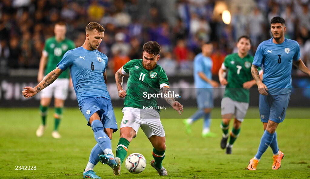 27 September 2022; Eden Karzev of Israel is tackled by Aaron Connolly of Republic of Ireland during the UEFA European U21 Championship play-off second leg match between Israel and Republic of Ireland at Bloomfield Stadium in Tel Aviv, Israel. Photo by Seb Daly/Sportsfile