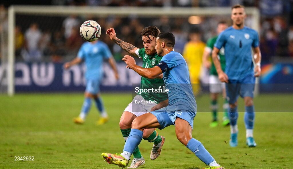 27 September 2022; Aaron Connolly of Republic of Ireland in action against Gil Cohen of Israel during the UEFA European U21 Championship play-off second leg match between Israel and Republic of Ireland at Bloomfield Stadium in Tel Aviv, Israel. Photo by Seb Daly/Sportsfile