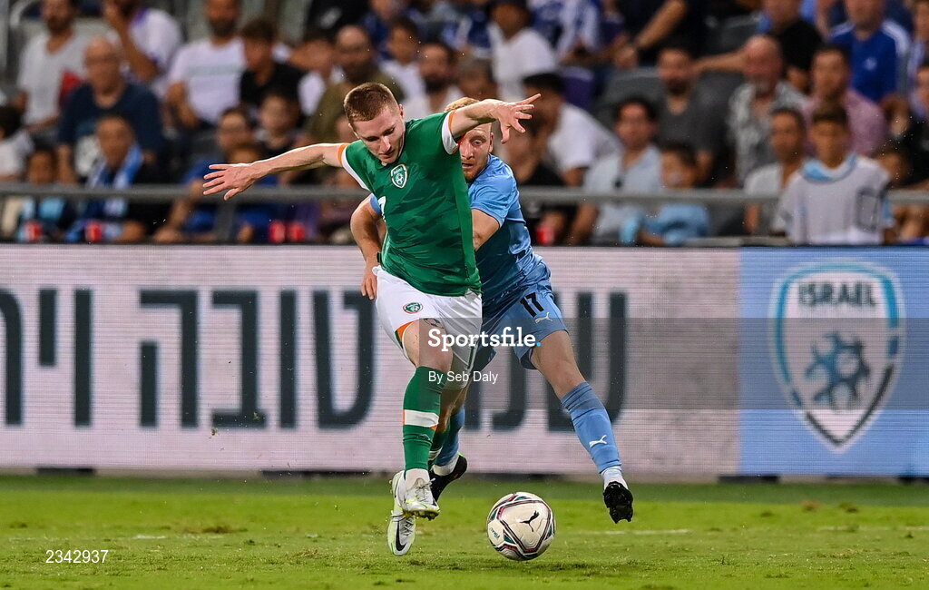 27 September 2022; Ross Tierney of Republic of Ireland is fouled by Ido Shahar of Israel during the UEFA European U21 Championship play-off second leg match between Israel and Republic of Ireland at Bloomfield Stadium in Tel Aviv, Israel. Photo by Seb Daly/Sportsfile