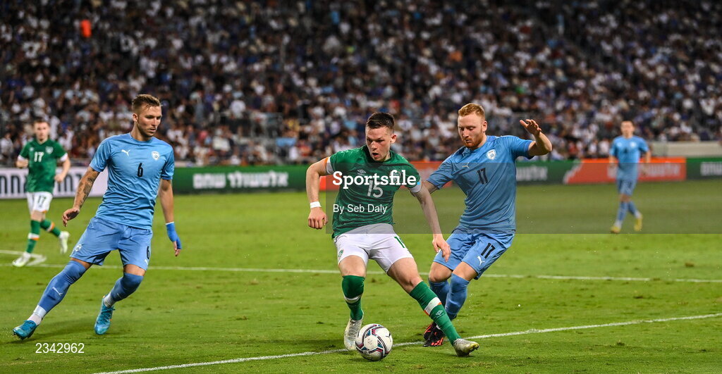 27 September 2022; Andy Lyons of Republic of Ireland in action against Eden Karzev and Ido Shahar of Israel during the UEFA European U21 Championship play-off second leg match between Israel and Republic of Ireland at Bloomfield Stadium in Tel Aviv, Israel. Photo by Seb Daly/Sportsfile