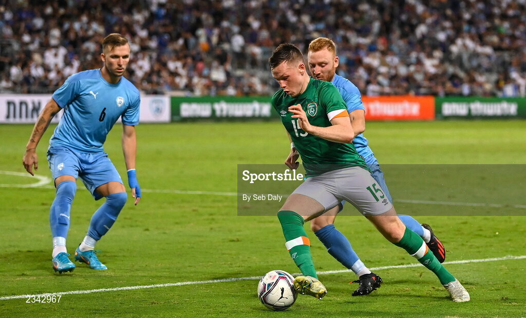 27 September 2022; Andy Lyons of Republic of Ireland in action against Ido Shahar of Israel during the UEFA European U21 Championship play-off second leg match between Israel and Republic of Ireland at Bloomfield Stadium in Tel Aviv, Israel. Photo by Seb Daly/Sportsfile