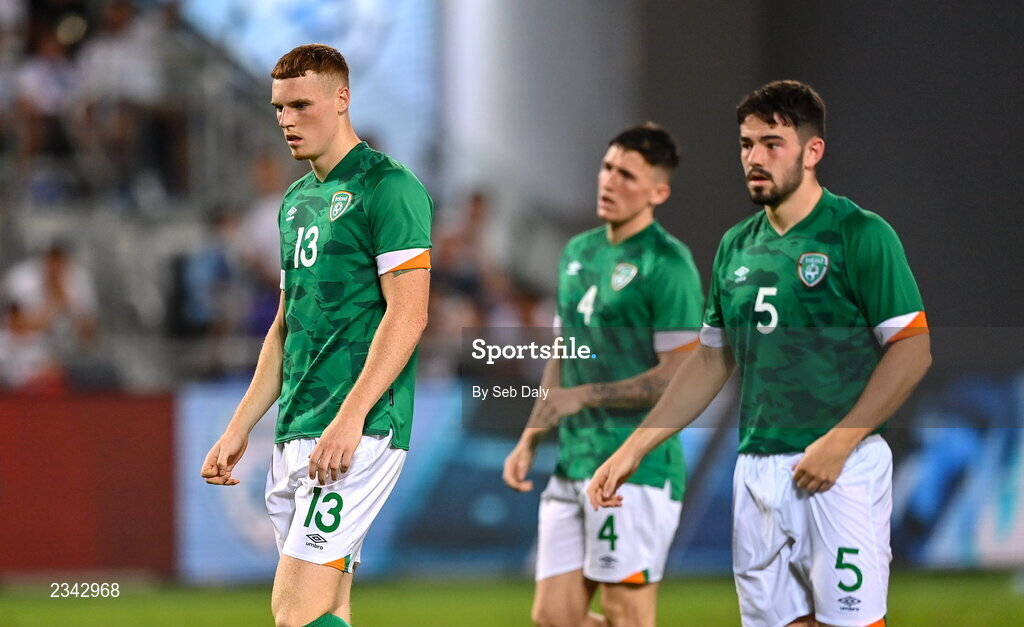 27 September 2022; Republic of Ireland players, from left, Jake O'Brien, Joe Redmond and Eiran Cashin during the UEFA European U21 Championship play-off second leg match between Israel and Republic of Ireland at Bloomfield Stadium in Tel Aviv, Israel. Photo by Seb Daly/Sportsfile