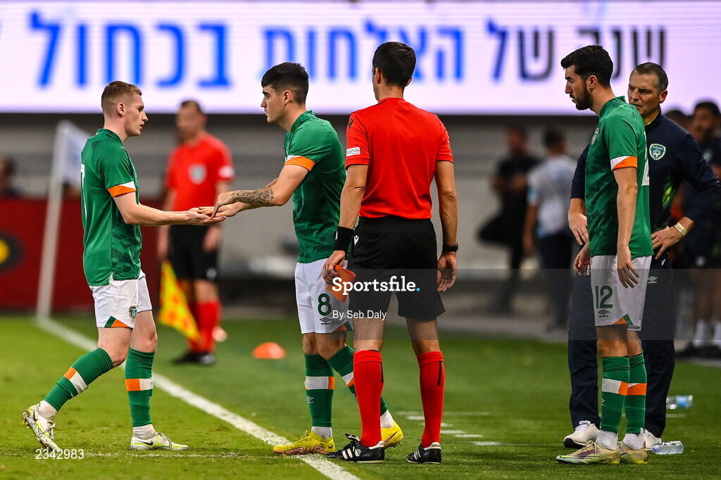 27 September 2022; Ross Tierney of Republic of Ireland is replaced by substitute Dawson Devoy during the UEFA European U21 Championship play-off second leg match between Israel and Republic of Ireland at Bloomfield Stadium in Tel Aviv, Israel. Photo by Seb Daly/Sportsfile
